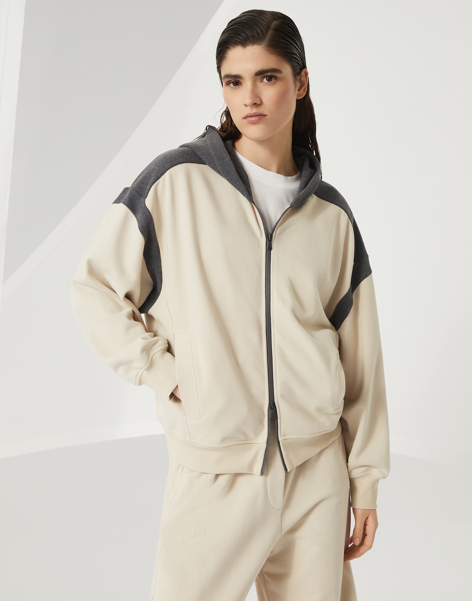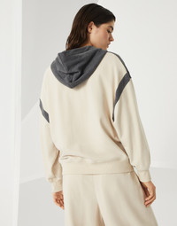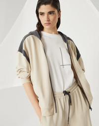 Refined Brunello Cucinelli materials are paired with the casual style of the Travelwear line, dedicated to moments of relaxation and leisure. This cotton Smooth French terry sweatshirt combines a sporty design and refined elements to create a design with an elegant feel: the zipper closure is illuminated with fine precious monili embroideries that leave sparkling trails across the garment for a distinctly feminine touch. MATERIALS The very soft hand of cotton Smooth French terry alternates with the slightly crisp, shimmering texture of lightweight taffeta. DETAILS Two-way zip closure Hood Hand pockets Nickel-free monili decoration 100% COTTON
