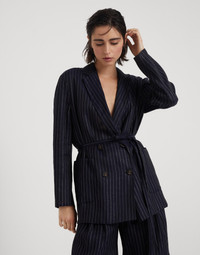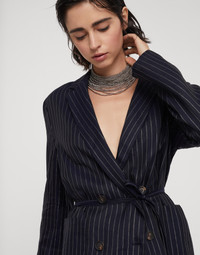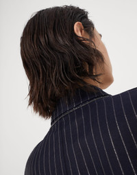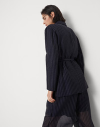 This cotton Sparkling Stripe garza blazer updates iconic tailored patterns in a feminine way. The light fabric with an almost transparent effect is enriched with a chalk stripe pattern created with a shiny lamé thread. A waist belt gathers the garment’s straight proportions, while a fine strip of monili behind the neck provides the piece with a further sparkling note. The blazer is designed to pair with the trousers made from the same fabric to create refined coordinated sets with the look of the season. MATERIALS Characterized by a plain weave, the fabric has a very light, almost transparent appearance because it’s made with a very sparse thread weave typical of garza. A shiny chalk stripe, created with two lamé threads inserted into the warp of the cotton garza, enriches the surface of the garment. DETAILS Horn button closure Unlined Patch pockets Single back vent Detachable belt Nickel-free monili decoration 97% COTTON, 2% CUPRO, 1% POLYESTER
