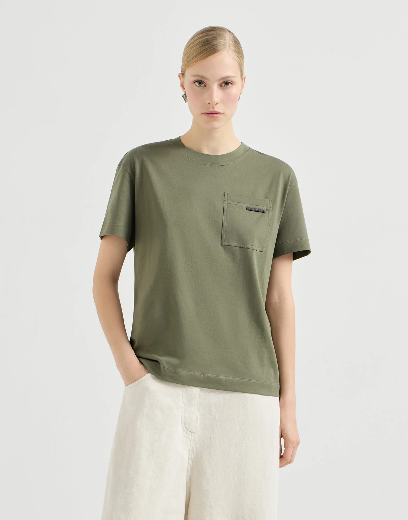 A sporty attitude and iconic elements define the style of this cotton jersey T-shirt. The style features a classic crew-neck and a regular fit. A precious monili embroidery enriches the chest pocket for a touch of feminine sparkle in true Brunello Cucinelli style. MATERIALS Research on the best materials elevates the sporty flavor of the pure cotton jersey inspired by the male wardrobe. The fabric is comfortable, lightweight and extremely pleasing to wear, perfect for every season. DETAILS Crew-neck Patch chest pocket Nickel-free monili decoration 100% COTTON