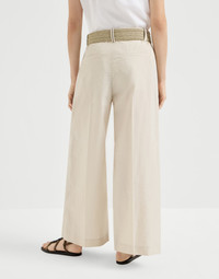 These cotton poplin A-line trousers represent a balanced mix of tailored details and casual style. The front pleats give the design a clean silhouette for an impeccable fit. The lines start off regular and progressively widen along the leg, bringing to mind the proportions of traditional palazzo trousers. The shiny monili detail completes the garment with a feminine sparkle in true Brunello Cucinelli style. MATERIALS Lightweight techno cotton poplin is a classic fabric of the Brunello Cucinelli collections. The presence of the synthetic fiber helps to preserve the texture’s slightly irregular effect. A silk-blend crepe lining provides added comfort. DETAILS Zip closure with metal hooks and backing button Elastic waistband Vertical front pockets Double pleat Plain hem Nickel-free monili decoration 75% COTTON, 25% NYLON