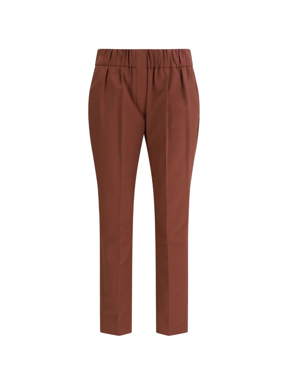 elasticated trousers Highlights - Brown - Elasticated waistband - Back welt pockets - Straight leg Made in Italy Composition Cotton 97%, Elastane 3% Washing instructions Read Manufacturer Guidelines