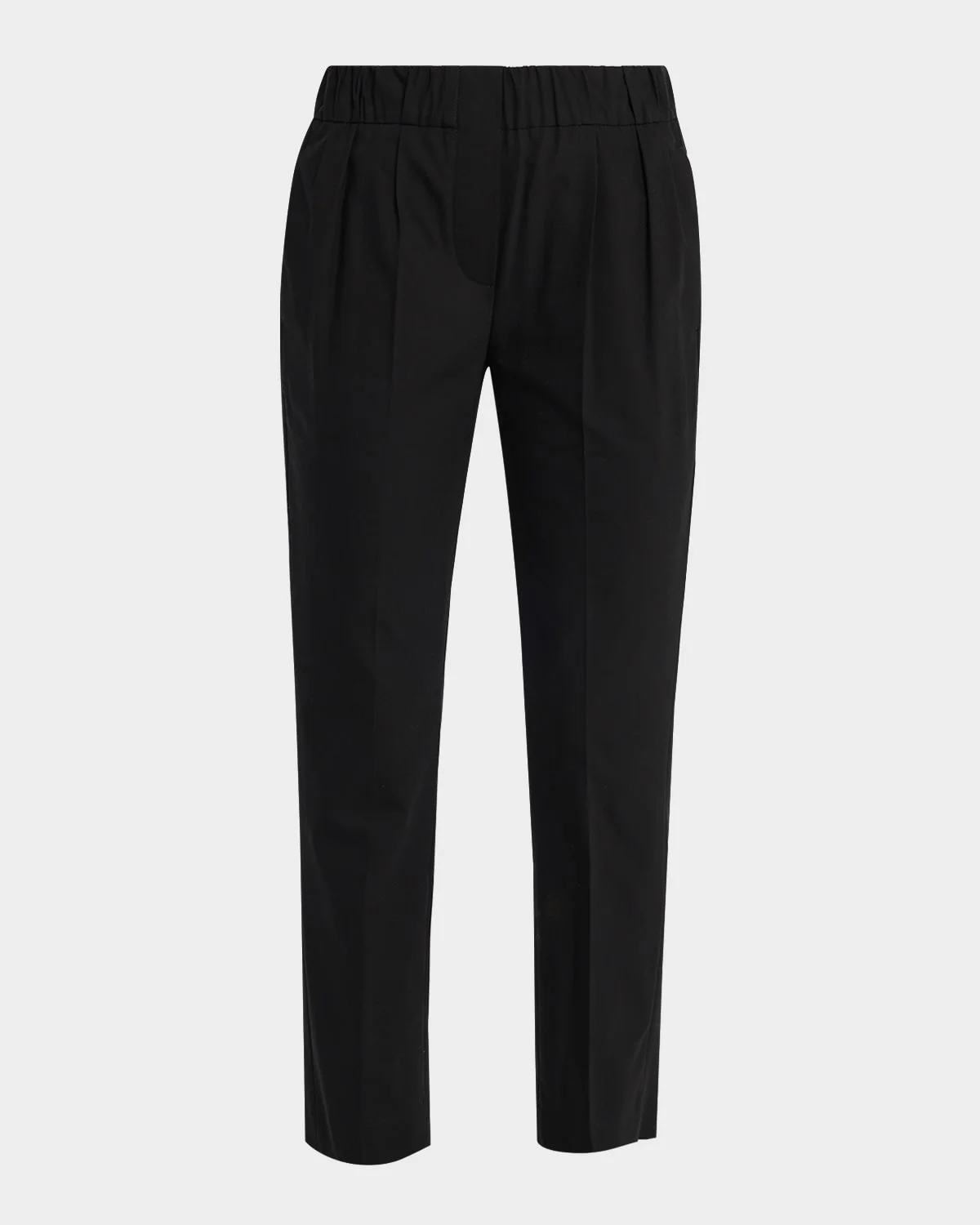Crafted from cotton stretch twill, these pants from Brunello Cucinelli feature an elasticized waistband and pressed front and back creases Mid rise sits high on hip Pleated front Side slip pockets Back & nbsp;welt pockets Slim legs Cropped at the ankle Pull-on style Cotton/elastane Lining: Polyester/acetate/cupro Made in Italy