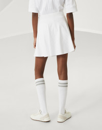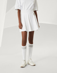 A sporty attitude and iconic elements define the style of the Mini skirt. This piece, designed for both sport club and game moments, features a wide ribbed design inspired by the world of knitwear. The practical drawstring waistband and integrated technical jersey shorts ensure maximum comfort even on the court. The iconic Solomeo heraldic coat of arms complements the look of the garment. MATERIALS The cotton interlock fabric has a compact, smooth and very soft texture that combines elegance with performance. DETAILS Pull-up skirt Built-in shorts 100% COTTON