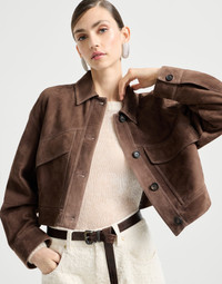 Refined materials and a contemporary silhouette define the style of this Couture suede cropped outerwear jacket. The leather’s compact, velvety texture enhances the season’s colors and complements the garment’s comfortable, cropped proportions. Details such as the classic collar and large angled flap pockets provide an effortless, casual elegance. A shiny monili embroidery behind the neck completes the style with a feminine sparkling note. MATERIALS Couture suede is a leather that combines a compact look, inspired by country style, with a soft and pleasantly velvety hand. The acetate and silk fabric lining ensures added comfort. DETAILS Horn button closure Shirt-style collar Button cuffs Patch hand pockets with flap Unlined Side buttons for fit adjustment Nickel-free monili decoration REAL LEATHER
