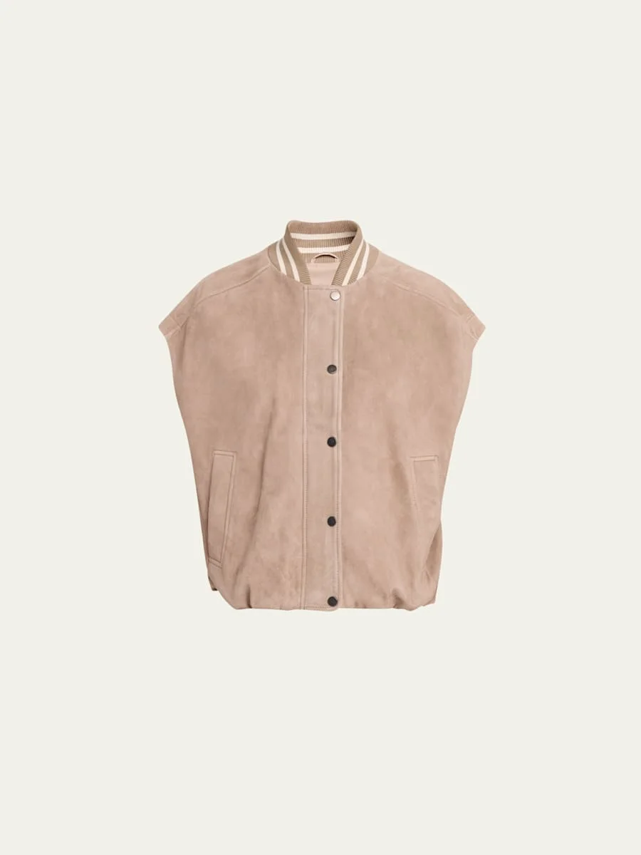 Crafted from couture lambskin suede, this varsity jacket from Brunello Cucinelli features a striped knit collar and a bubble cinched hem Baseball collar; snap concealed zip front Sleeveless Hip welt pockets Oversized fit Hip length Leather Lining: Acetate/silk Dry clean Made in Italy SIZE amp; FITModel measurements: 5'10" tall Model is wearing a US size 4/Small