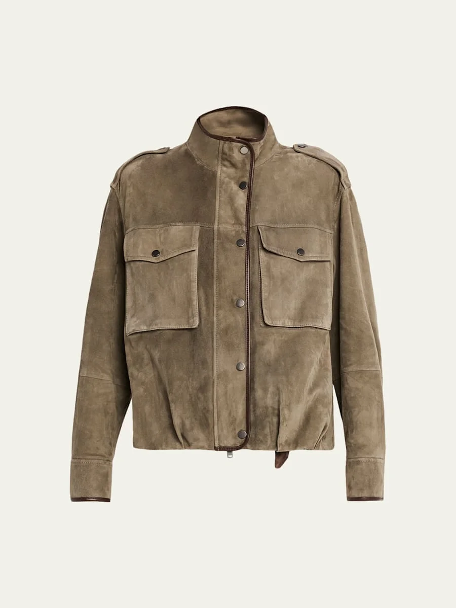 Brunello Cucinelli utility jacket is crafted from a couture lamb suede featuring contrast leather piping and a monili loop on the back of the neck Stand collar; snap concealed zip front Long sleeves; snap cuffs Shoulder epaulets Yoked back; box pleat Chest snapflap pockets Hip slip pockets Relaxed fit Hip length Suede Lining: Acetate/silk Made in Italy