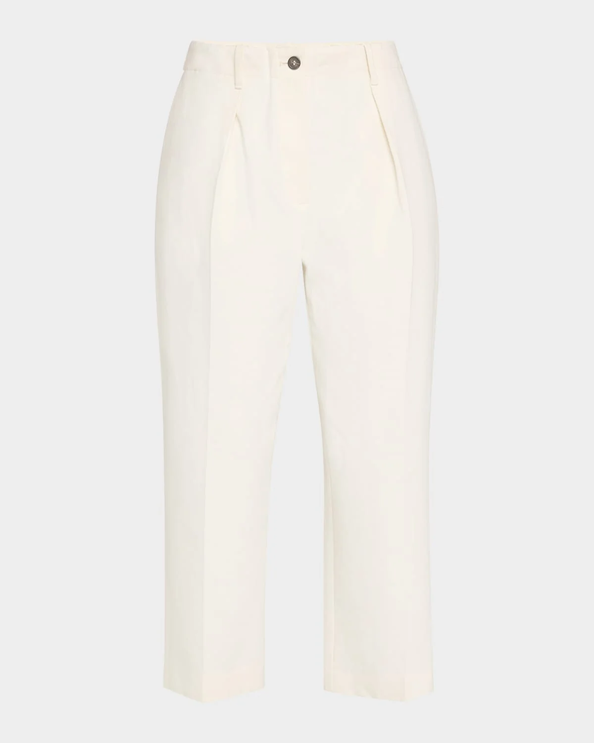- Brunello Cucinelli creased square chino pants - Cropped fit - Mid rise sits high on hip - Straight legs - Side slip pockets; back flap-buttoned pockets - Button/zip fly; belt loops - Cotton/wool/polyester - Lining: Polyester/acetate - Made in Italy