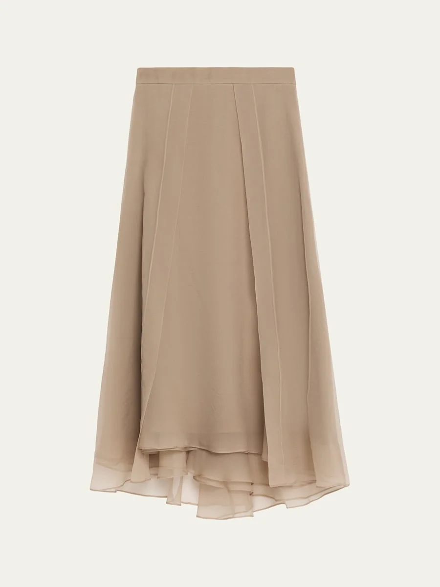 Crafted from crispy silk organza, this skirt from Brunello Cucinelli is finished with an ethereal, flowy overlay cut on the bias for ease of movement High waist Aline silhouette Hem falls below the knee Invisible back zip Silk Lining: Acetate/silk Dry clean Made in Italy SIZE amp; FITModel measurements: 5'10" tall Model is wearing a US size 4/Small
