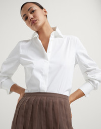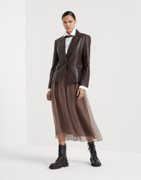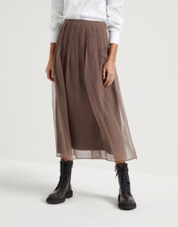Precious fabrics and ethereal volumes define the feminine allure of this Pleated Midi skirt. The thin and slightly crispy texture of fine Crispy silk accompanies the lightweight lines of the skirt, highlighted by pleating, while a crêpe silk blend lining helps to make the elegant sheer fabric not see-through. A fine shiny monili embroidery illuminates the waist and complements the aesthetic of the garment with a precious note. MATERIALS Refined Crispy silk is an ultra fine fabric characterized by a transparent, matte texture. The fabric’s delicate color stems from a particular dye that preserves the fiber’s natural crinkled effect. DETAILS Zip closure Silk-blend crêpe lining Nickel-free monili decoration 100% SILK