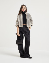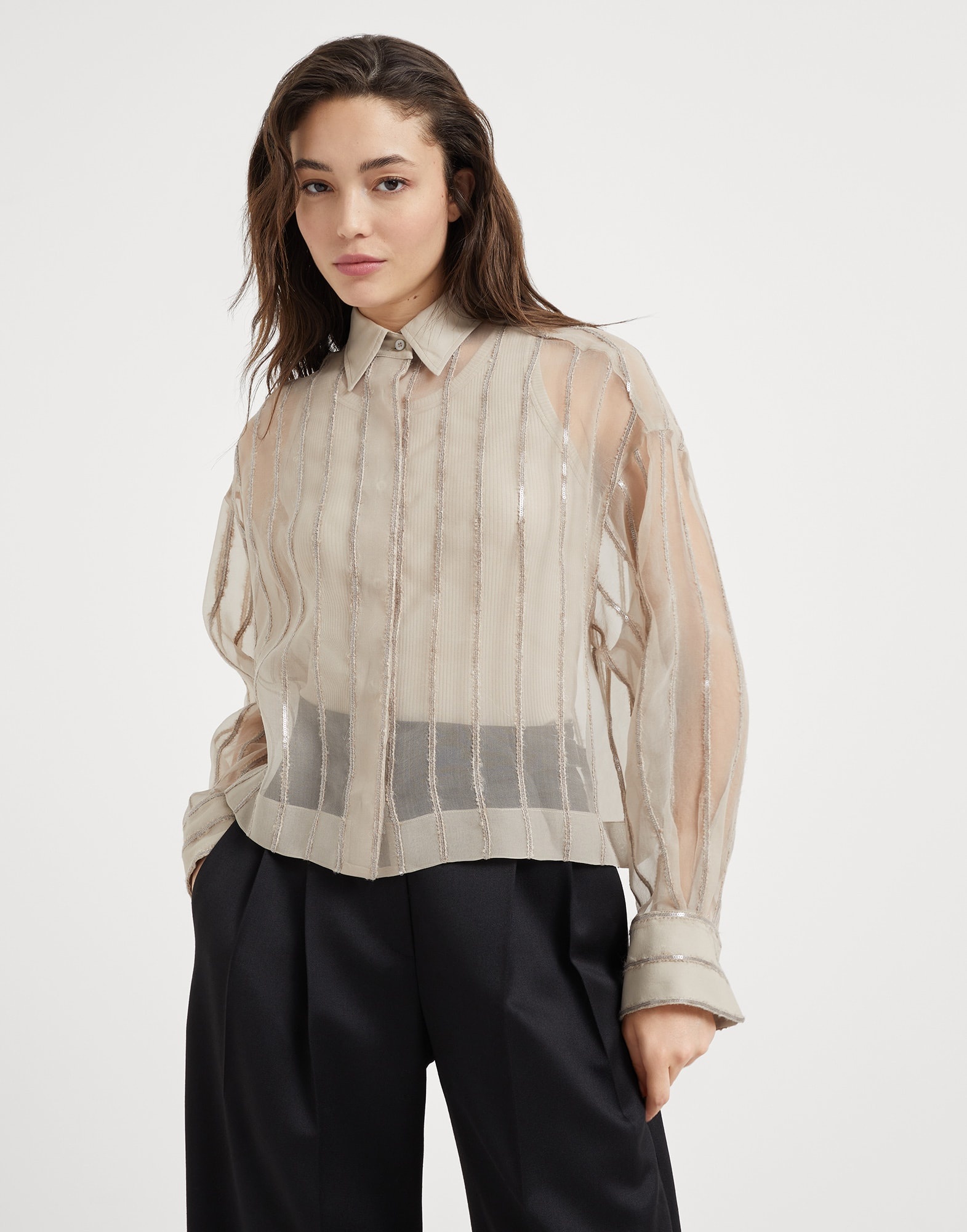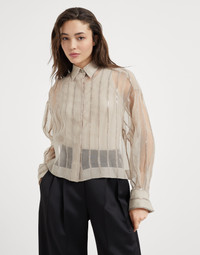 Precious details and an ethereal appearance define the feminine feel of this Crispy silk shirt with Dazzling Alpaca Stripes. The classic striped pattern is reinterpreted on the crisp surface through the combination of mohair thread, with a typically airy appearance, and the delicate sparkling reflections of small tonal sequins. The contrasting textures give the garment a sophisticated look, while the wide cuffs and slightly cropped cut complete the garment’s contemporary aesthetic. MATERIALS Refined Crispy silk is an ultra fine fabric characterized by a transparent, matte look. The fabric’s delicate color stems from a particular dye that preserves the fiber’s natural textured effect. DETAILS Mother of pearl button closure Classic collar Cuffs have one mother of pearl button Special workmanship 100% SILK