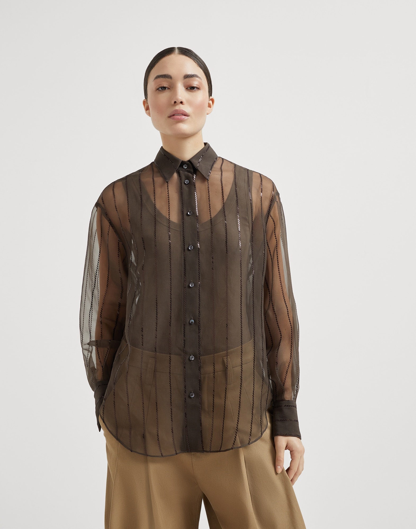 Refined materials and elegant details elevate the style of this new shirt. With a sheer effect, the Crispy silk base is enriched with a sophisticated chalk stripe pattern, inspired by the world of masculine elegance, which uses a fine thread of small sequins to create a very feminine shimmering design. The fit offers soft, straight proportions with slightly dropped shoulders. MATERIALS Refined Crispy silk is an ultra fine fabric characterized by a transparent, matte look. The fabric’s delicate color stems from a particular dye that preserves the fiber’s natural textured effect. DETAILS Mother of pearl button closure Classic collar Cuffs have one mother of pearl button 100% SILK