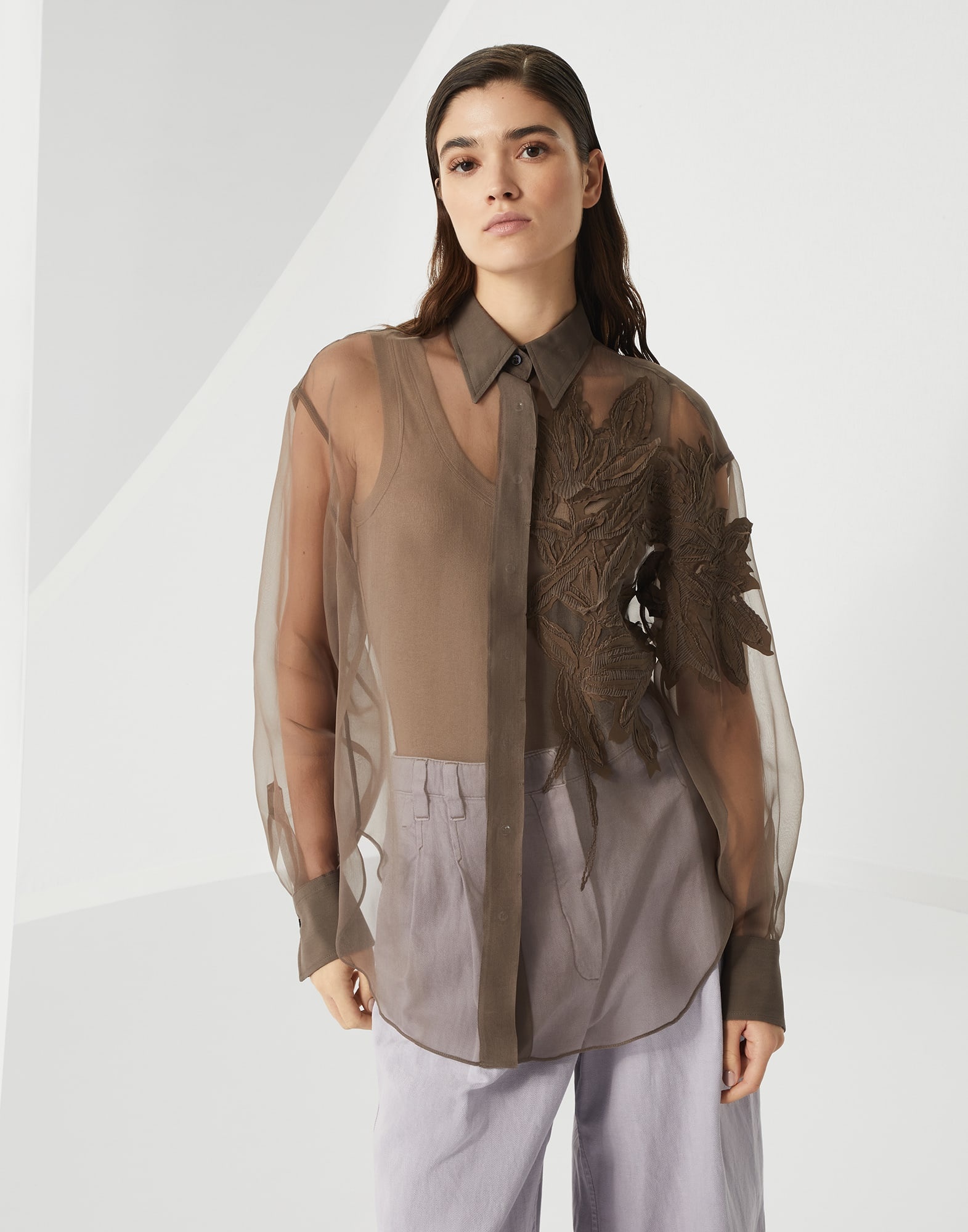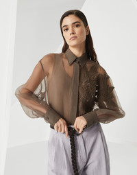 A luxurious, sophisticated aesthetic defines the concept of this new Crispy silk shirt. Inspired by nature’s beautiful shapes, the Herbarium embroidery stands out on the Crispy silk’s ethereal, crisp and impalpable texture for an elegant, feminine touch. The fit features slightly oversized lines with generous sleeves. MATERIALS Refined Crispy silk is an ultra fine fabric characterized by a transparent, matte look. The fabric’s delicate color stems from a particular dye that preserves the fiber’s natural textured effect. DETAILS Classic collar Cuffs have one mother of pearl button 100% SILK