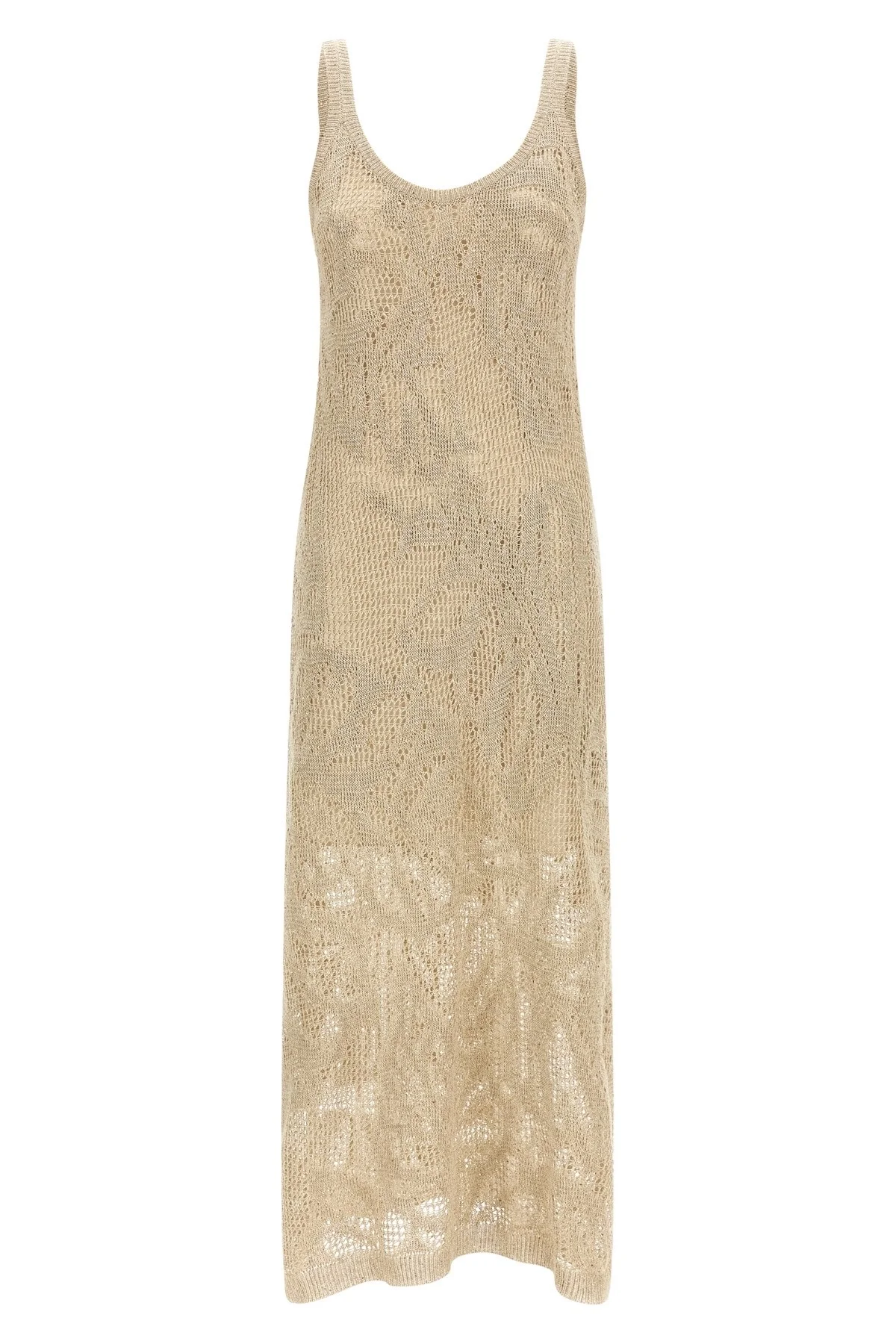 cod. MDT771A92C8925 Long dress in linen and cotton blend crocheted with micro sequin application, thin straps, wide round neckline front and back, sleeveless, removable petticoat. Color: Beige Size & Fit: true to size fit Composition: 94% linen 6% cotton Made in: Italy
