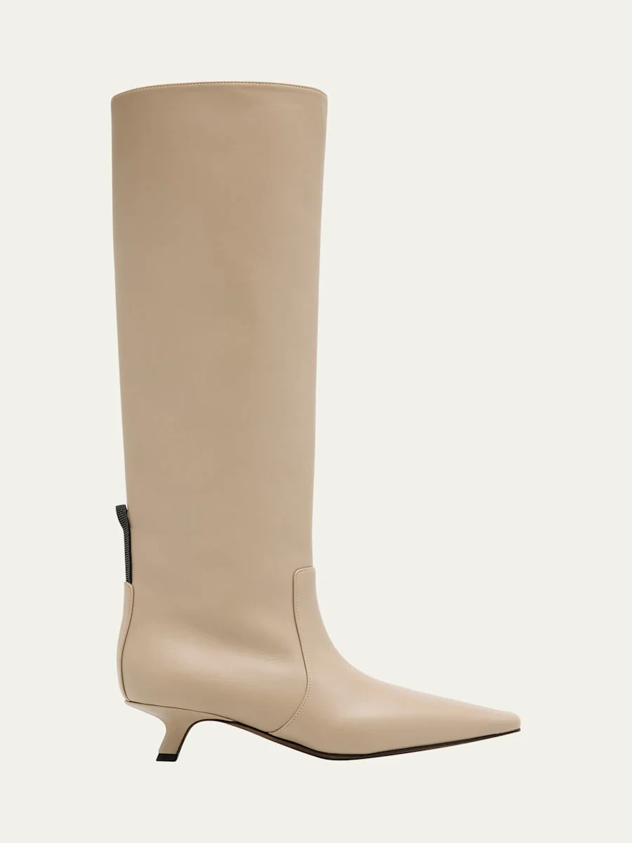 Brunello Cucinelli crocodile-embossed suede knee boots with beaded monili pull tab accent 1.38 in / 35 mm comma heel Snipped, pointed toe Pull-on style Leather outsole Lining: Leather Made in Italy Online Inquiries: BGS21_X6UUK| Store Inquiries: #4981394