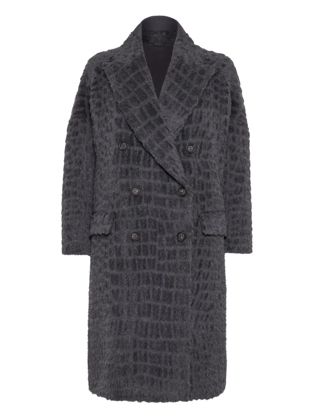 crocodile-effect coat Highlights - Charcoal grey - Double-breasted fastening - Notched lapel - Flap pockets - Long sleeves Made in Italy Composition Outer: Alpaca 50%, Virgin Wool 50% Washing instructions Read Manufacturer Guidelines