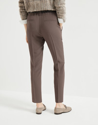 Silk and acetate crepe cady fabric provides a fluid and sophisticated touch to the essential lines of these Tailored Jogger trousers. The regular fit is enhanced by the small pleats that complement the soft proportions in the seat and the regular cut down the leg. The elastic waistband reflects the characteristic silhouette of sporty trousers. MATERIALS A classic fabric of the Brunello Cucinelli collections, the silk and acetate cady crepe is characterized by a slightly crushed appearance and an ultra lightweight texture. DETAILS Pull-up trousers Front pockets Back welt pockets Pleat 52% ACETATE, 48% SILK