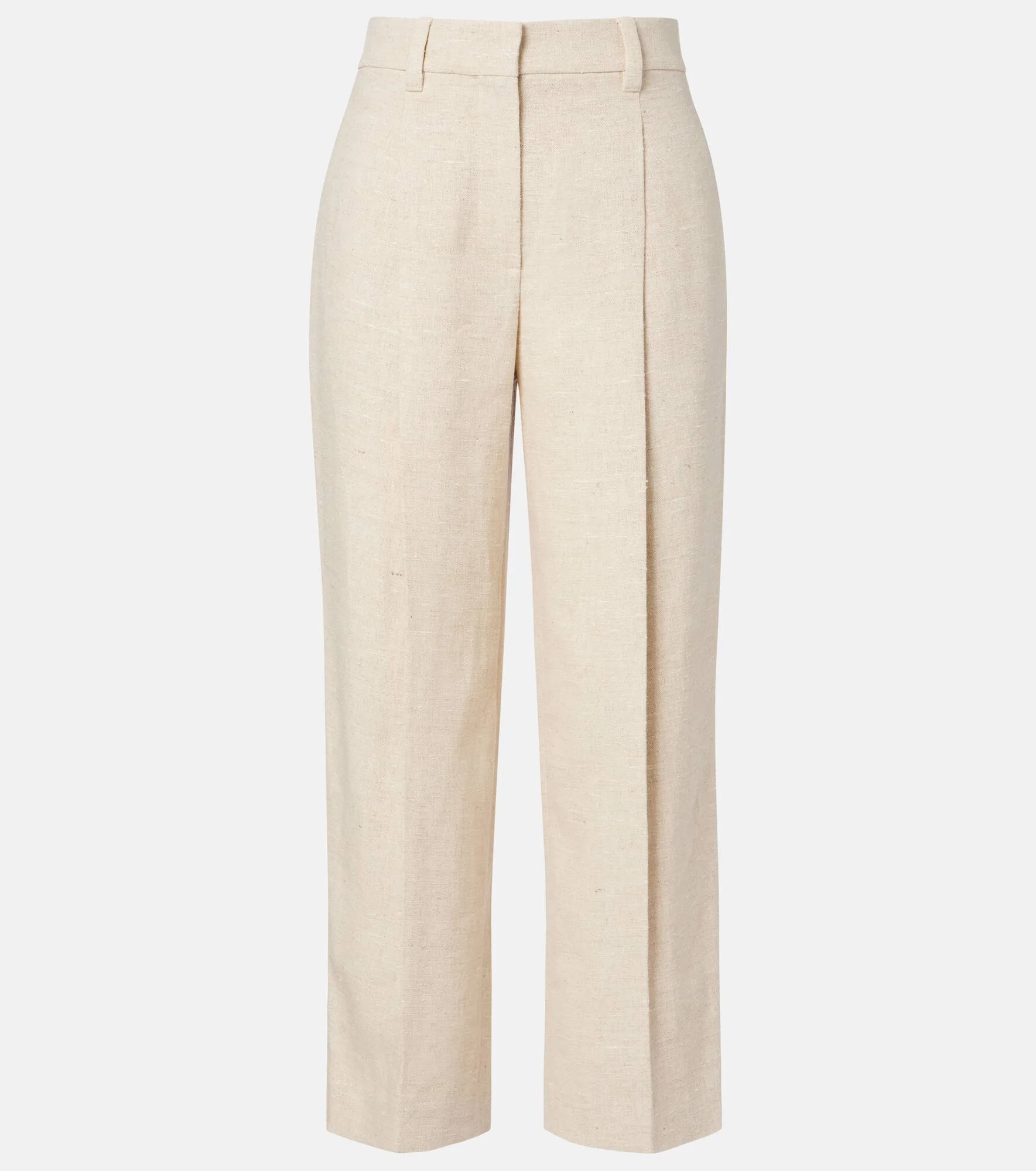 Brunello Cucinelli's designs are created in Solomeo, a medieval hamlet whose art and traditions are woven into the house's every fiber. Made from a linen and silk blend, these wide-leg pants feature a cropped silhouette. Product Details - Material: 51% linen, 26% silk, 23% hemp - Care instructions: dry clean - Made in Italy - Designer color name: Beige - Item color: beige - Lining: 65% acetate, 35% polyester - Lining II: 100% cotton - Details: 100% brass - Contains non-textile parts of animal origin - Closure: zip, hook, and button fastening - Item number: P01143599 Size & Fit - True to size - Non-stretchy fabric - Wide-leg - The model seen in the picture is 178cm-5'10" and wearing a size IT 40