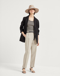 Tailored inspiration and a casual feel come together in these new viscose and linen Slouchy trousers. The Fluid twill’s light, crisp texture pairs perfectly with the informal silhouette, enriched with pleats that run along the length of the garment, providing a flawless appearance. A fine monili embroidery adds a delicate sparkle in true Brunello Cucinelli style. MATERIALS The combination of viscose and linen gives this twill a lightweight, flowing yet slightly crushed appearance. The characteristics of the fabric are further highlighted by the nuanced color variations. DETAILS Zip closure with metal hook and backing button Front pockets Back welt pockets Double pleat Nickel-free monili decoration 73% VISCOSE, 27% LINEN
