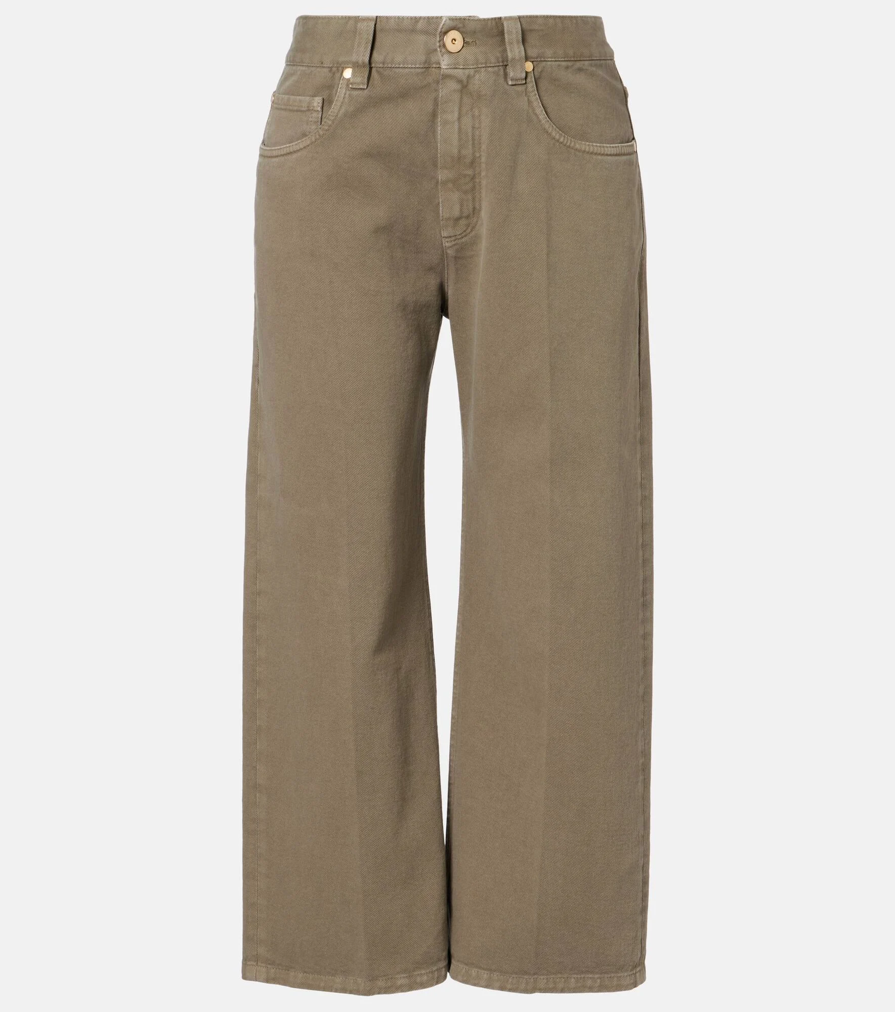 These Brunello Cucinelli jeans are able to elevate even the simplest of looks with their refined aesthetic. This cropped pair features a high-rise, wide-leg silhouette with a classic five-pocket style. Product Details - Material: 100% cotton - Care instructions: machine wash at 30 degrees - Made in Italy - Color: green - Designer color name: Military - Item color: green - Lining: 100% cotton - Details: 100% brass - Insert: 100% leather - Contains non-textile parts of animal origin - Hardware color: gold - Closure: zip and button fastening - Belt loops - Pockets: five pockets - Item number: P01143619 Size & Fit - True to size - Non-stretchy fabric - Straight leg - Mid-rise - The model seen in the picture is 178cm-5'10" and wearing a size IT 40