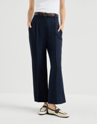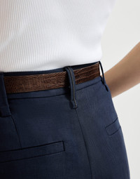 Casual elegance and refined materials define these square cigarette trousers. The crisp, lightweight texture of viscose and linen fluid twill complements the feminine silhouette, characterized by fitted lines in the seat that flare slightly at the bottom. The iconic shiny monili embroidery adds a sophisticated sparkling note in true Brunello Cucinelli style. MATERIALS The blend of viscose and linen gives the twill a lightweight, very fluid appearance that is semi-crisp at the same time. DETAILS Zip closure with button and backing button Slanted front pockets Back welt pockets Plain hem Nickel-free monili decoration 72% VISCOSE, 28% LINEN