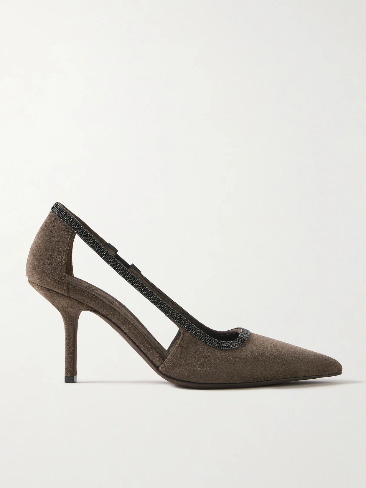 Fans of Brunello Cucinelli may recognize these pumps by the signature Monili beading along the foot-framing straps. Made in Italy from suede, they're set on slender 80mm heels and have side cutouts and sharply pointed toes.