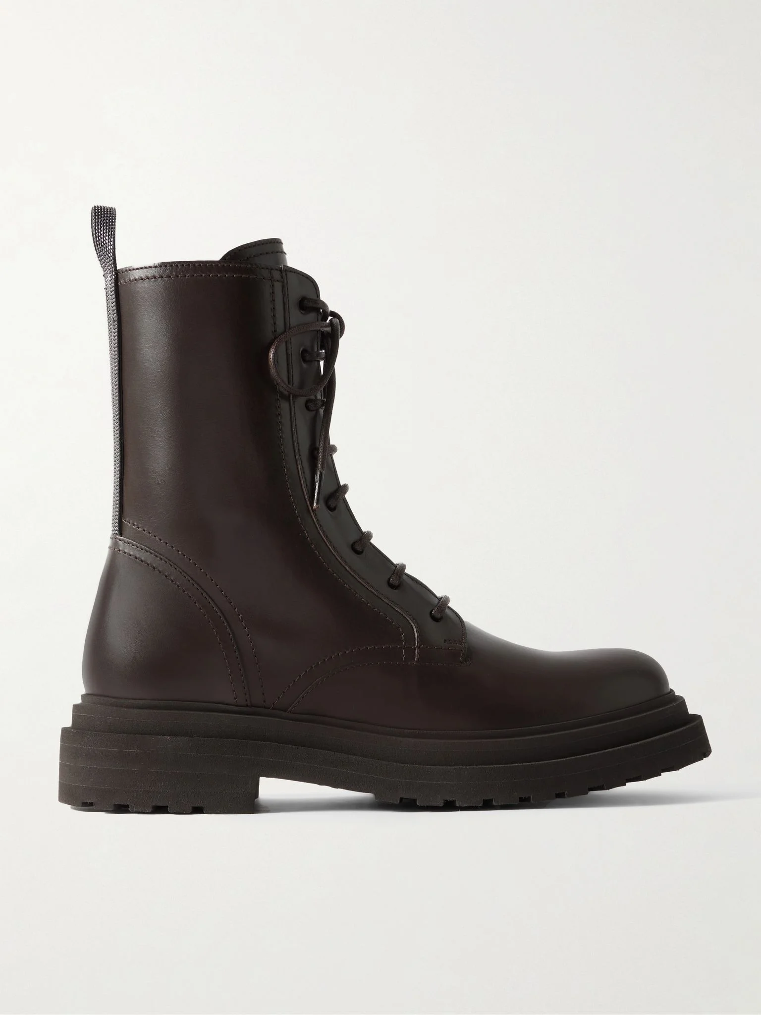 Brunello Cucinelli's ankle boots may be modeled on classic combat styles but the signature Monili beads along the back give them a cool, glamorous feel. They've been made in Italy from smooth leather and feature zip fastenings for easy on and off. Size & Fit - Fits true to size, take your normal size - Italian sizing Details & Care - Heel measures approximately 30mm/ 1 inch - Dark-brown leather - Lace-up front, concealed zip fastening along side