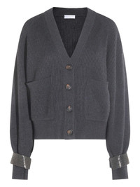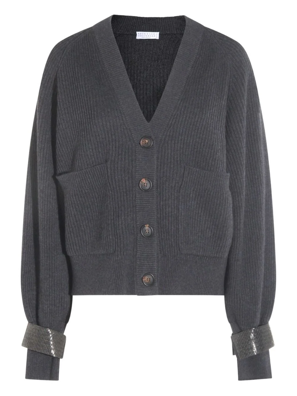 embellished ribbed cardigan Highlights - Grey - Ribbed knit - V-neck - Patch pockets - Button front - Embellished cuffs Made in Italy Composition Cashmere 100% Washing instructions Read Manufacturer Guidelines