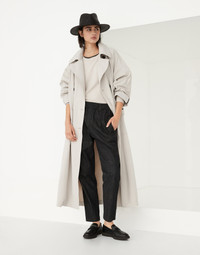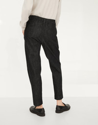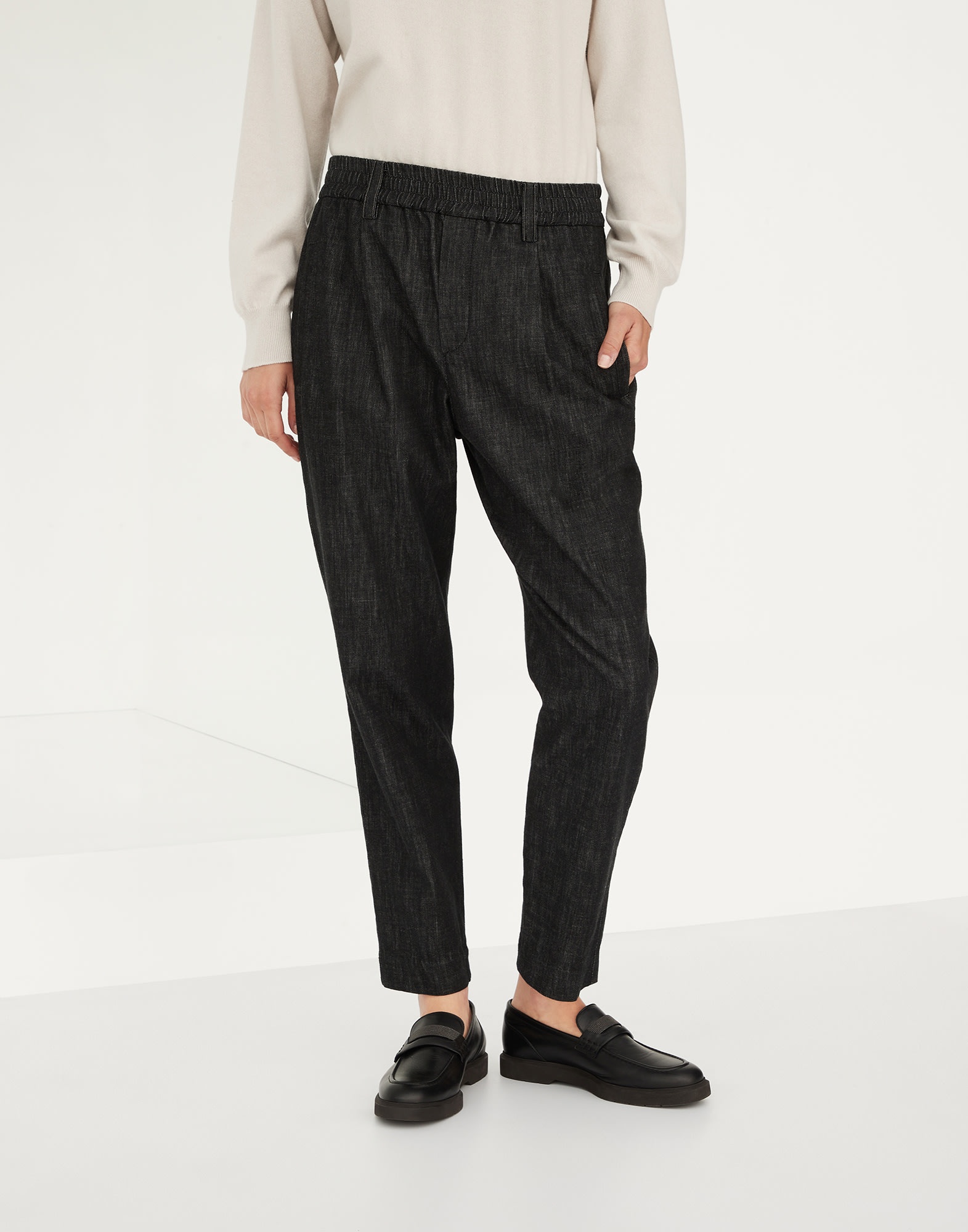 Tailored-inspired elements pair perfectly with an informal silhouette and functional details in these Dark Polished Denim Baggy trousers. The elasticized waistband adds a sporty touch to the garment and gathers the volume that descends straight down the leg and slightly tapers at the bottom, while the pleat detail introduces a sophisticated design contrast. An embroidery made of fine rows of monili illuminates the belt loops with a feminine touch in true Brunello Cucinelli style. MATERIALS The Japanese denim is offered in an intense and shiny color which, thanks to a special dye, maintains the effect of the shading even after washing. DETAILS Pull-up trousers Front pockets Pleat Back welt pockets Nickel-free monili decoration 100% COTTON