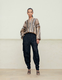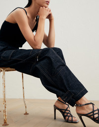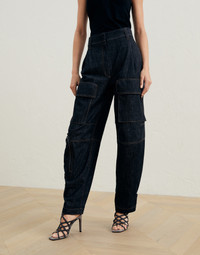 Sporty details define the contemporary yet refined allure of these Dark Polished denim pants. The typical double seams in contrasting colors stand out on the nuances of the lightweight fabric, while pleats and a high-rise design introduce a classic note. Large front pockets add functional and styling elements and are perfectly suited for the adjustable one-button leg bottom that subtly gathers the straight and relaxed leg volumes. MATERIALS The Japanese denim is offered in an intense and shiny color which, thanks to a special dye, maintains the effect of the shading even after washing. DETAILS Zip closure with metal hooks and backing button Cargo pockets with flap and button Cargo pocket with zipper Pleat Back welt pockets Button at hem Nickel-free monili decoration 100% COTTON