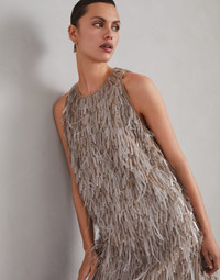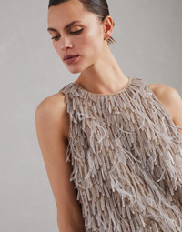 Sparkling embellishments with a feminine feel are paired with refined Brunello Cucinelli materials in this new Dazzling Cascade Embroidery dress. Elegant feather and light sequin embroideries spread delicate reflections with every movement and enrich the Crispy silk fabric, creating a unique combination of fluid lines and sophisticated details. The fluid, essential lines define the garment’s fit. MATERIALS Refined Crispy silk is an ultra fine fabric characterized by a transparent, matte look. The fabric’s delicate color stems from a particular dye that preserves the fiber’s natural textured effect. DETAILS Crew-neck Zip closure Teardrop opening with button at back of neck Silk-blend crepe lining Special workmanship 100% SILK
