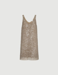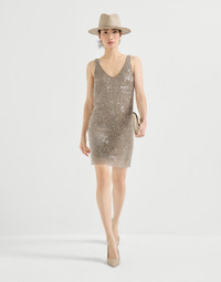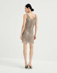 Inspired by radiant summer landscapes, this crispy silk mini dress with dazzling cascade embroidery combines refined materials with precious embellishments. The lightweight crispy silk base is entirely illuminated by a sophisticated embroidery of rectangular micro-sequins which, like small sparkling fringes, replicate the fluid movements of water, creating a "wet" effect. A delicate transparency gives the garment an elevated, feminine allure. MATERIALS Refined Crispy silk is an ultra fine fabric characterized by a transparent, matte look. The fabric’s delicate color stems from a particular dye that preserves the fiber’s natural textured effect. DETAILS Wide neckline Silk-blend crepe lining Concealed zip closure at side 100% SILK