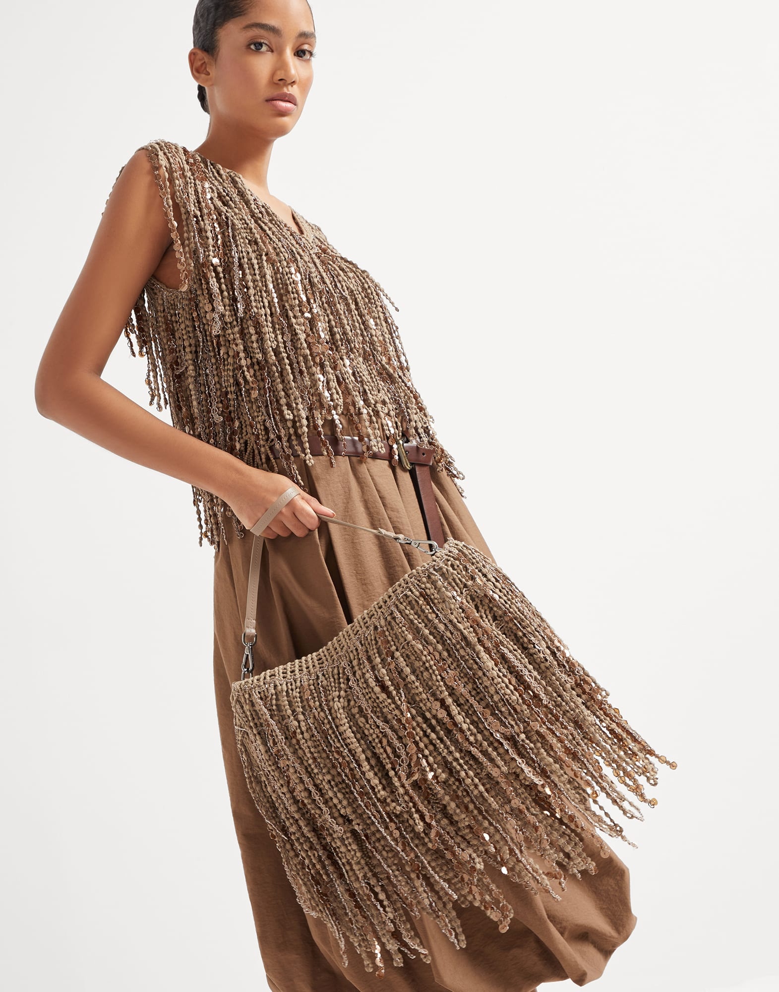 The world of knitwear meets the world of leather goods in the new Dazzling Cascades knit clutch bag. Precious seasonal embroidery enriches the essential silhouette, while the simplicity of the cotton yarn is exquisitely elevated to give life to a jewel-like decoration skillfully handcrafted by artisans. A cascade of irregularly shaped fringes comes to life with sparkling three-dimensional sequins which, thanks to the different sizes, spread shiny reflections with every movement, creating a luminous effect that covers the entire surface of the accessory. MATERIALS The cotton yarn, with its simple and linear appearance, expresses itself in an exceptional way, giving life to unique and sophisticated workmanship. Made of the same material as the fringes, the base structure is a very even netting with refined embroidery on top. DETAILS Zip closure Detachable shoulder strap Internal pocket with zip closure Cotton lining Bag is 42 cm (16.54") long, 2 cm (0.79") wide, and 25 cm (9.84") high 76% COTTON, 24% NYLON
