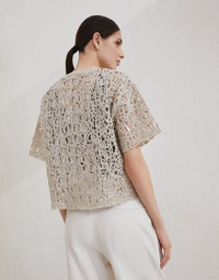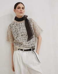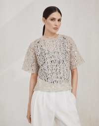 The season’s precious patterns enrich the essential lines of this dazzling croc embroidery knit T-shirt. The protagonist of the style is an elegant croco-effect embroidery, created by combining the natural characteristics of the yarns with the slightly three-dimensional, shiny effect of sequins, recreating a rich surface that is light and sophisticated at the same time. Straight and soft, the silhouette is completed by generous short sleeves and a classic crew-neck. MATERIALS The workmanship uses refined mohair fibers, crafted together with silk and linen yarns, to ensure the embroidery’s light structure that makes up the garment’s entire surface. The sequins add a touch of sparkle and a three-dimensional effect, enriching the design. DETAILS Crew-neck Drop shoulder Wide sleeve Special workmanship 31% MOHAIR, 20% NYLON, 18% SILK, 17% LINEN, 14% POLYESTER