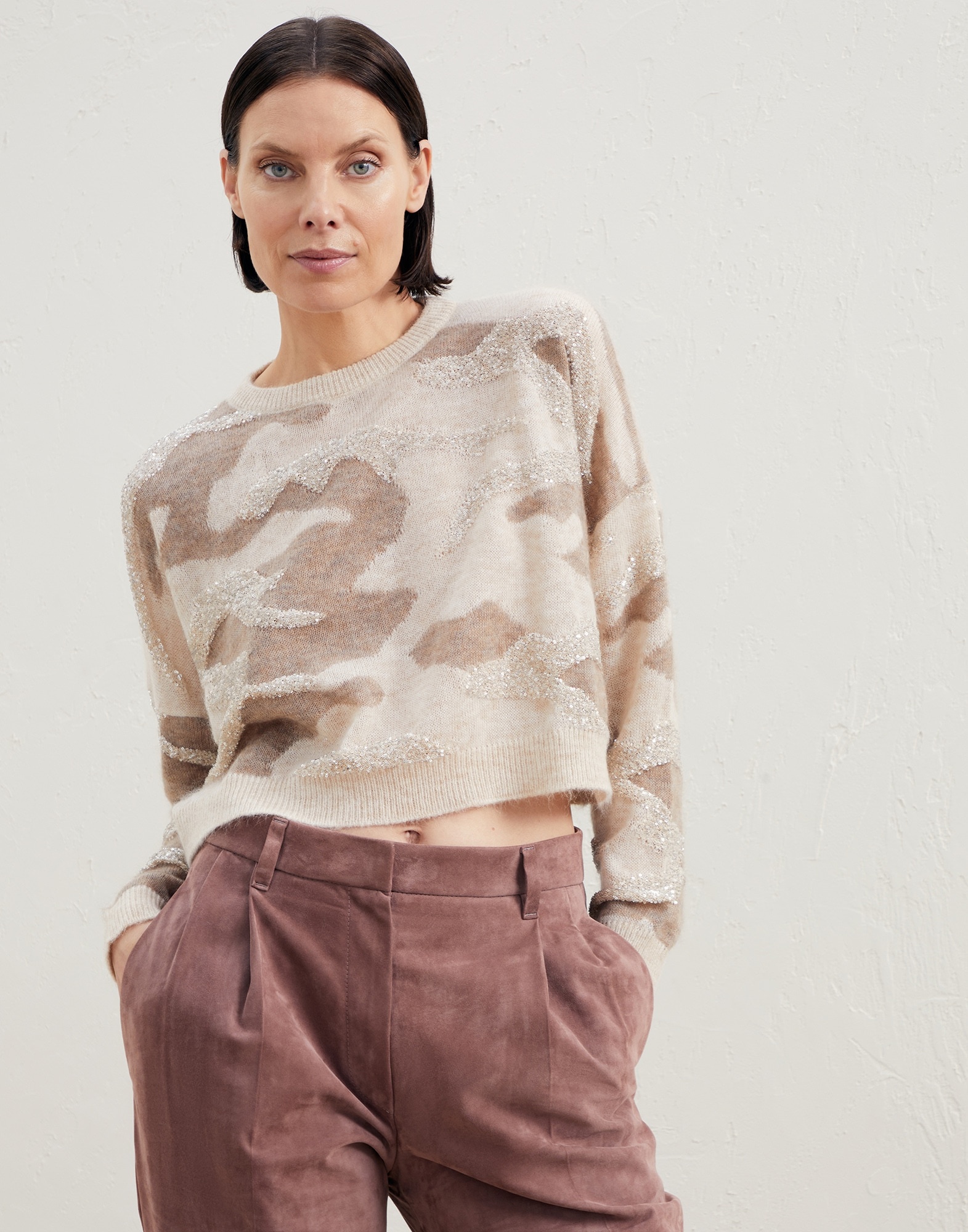 Refined jacquard workmanship reinterprets the camouflage pattern of this sweater in a modern, elegant way. The precious mohair and wool yarn gives the garment a soft, slightly full appearance, while a special technique enriches the entire surface with a sophisticated, slightly three-dimensional intarsia-knit design. In addition, a lamé thread and a thread of shiny paillettes embellish the pattern with touches of feminine sparkle. A cropped silhouette and relaxed lines with dropped shoulders define the fit. MATERIALS The mohair and wool yarn offers a lightweight, cozy texture with a slightly airy look. Adding a synthetic fiber helps to maintain the fabric’s structure and guarantee comfort. DETAILS Crew-neck Drop shoulder Jacquard-knit 50% MOHAIR, 36% NYLON, 14% WOOL