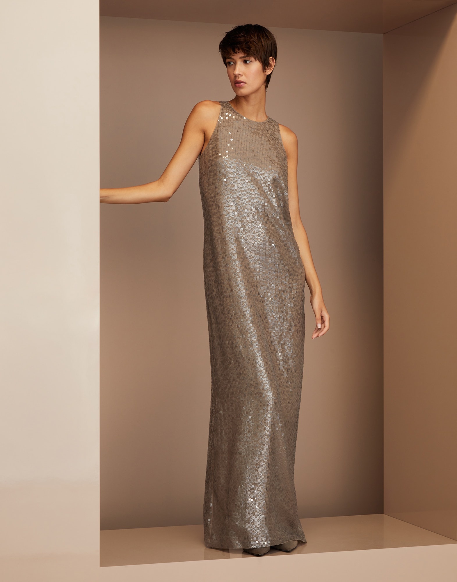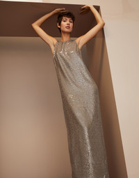 The shimmering look of this new Crispy silk Dazzling Embroidery dress is perfect for special occasions. Made up of large paillettes, the embroidery covers the entire surface of the garment, recreating a very striking mirrored effect. The proportions are straight and regular through the torso and down the leg. A silk-blend crêpe lining completes the garment. MATERIALS Refined Crispy silk is an ultra fine fabric characterized by a transparent, matte look. The fabric’s delicate color stems from a particular dye that preserves the fiber’s natural textured effect. DETAILS Crew-neck Teardrop opening with button at back of neck Silk-blend crêpe lining 100% SILK