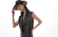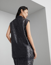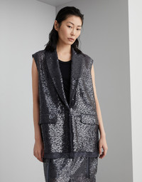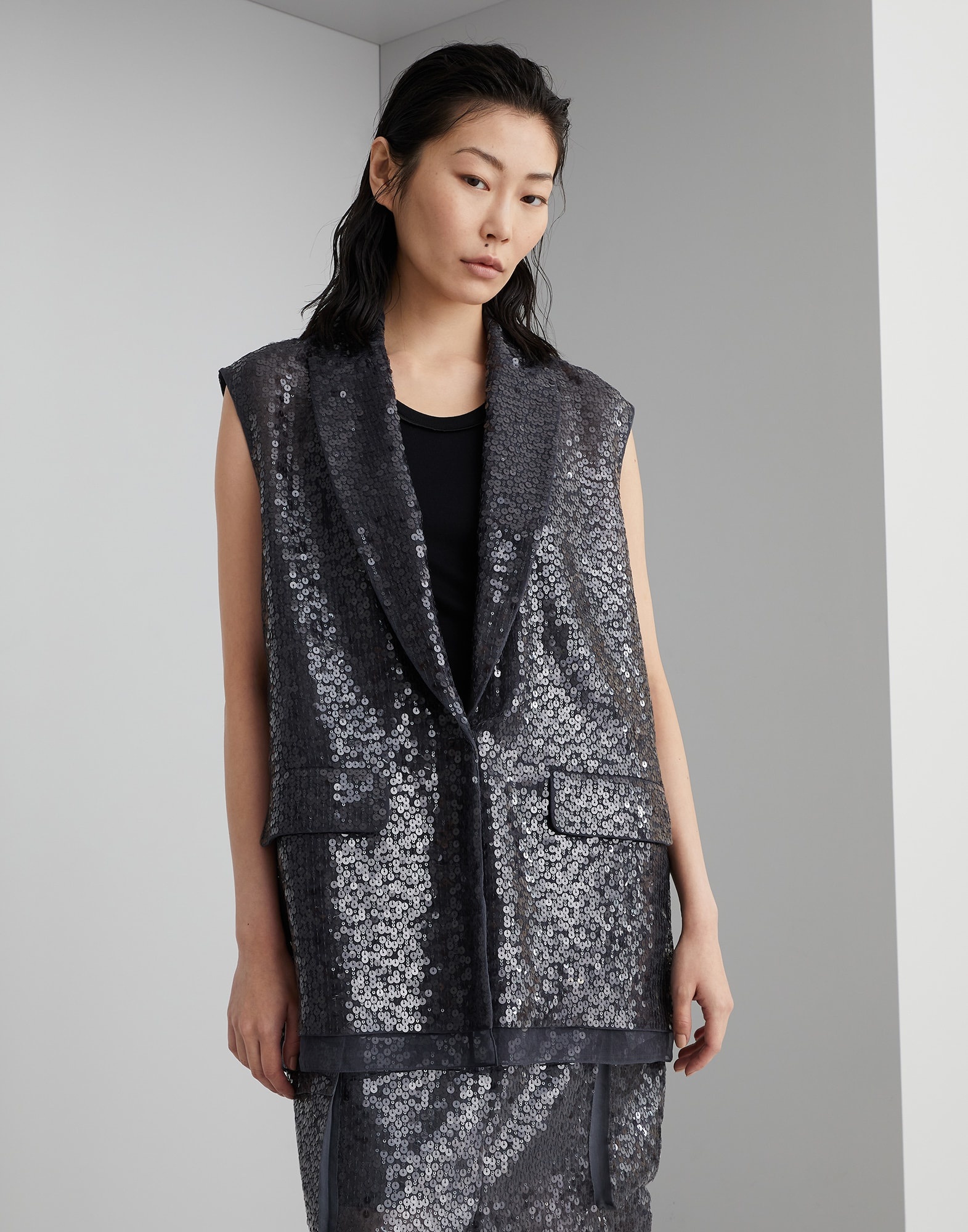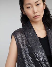Elegance and skillful craftsmanship define the extremely feminine style of this new Crispy silk vest. The fabric’s fluid, ethereal texture is paired with a special technique where fine rows of small paillettes cover the entire surface of the garment in a diagonal embroidery with a sparkling, faceted effect. The soft silhouette makes the vest versatile and sophisticated at the same time. MATERIALS Refined Crispy silk is an ultra fine fabric characterized by a transparent, matte look. The fabric’s delicate color stems from a particular dye that preserves the fiber’s natural textured effect. DETAILS Welt pockets with flap Unlined 100% SILK