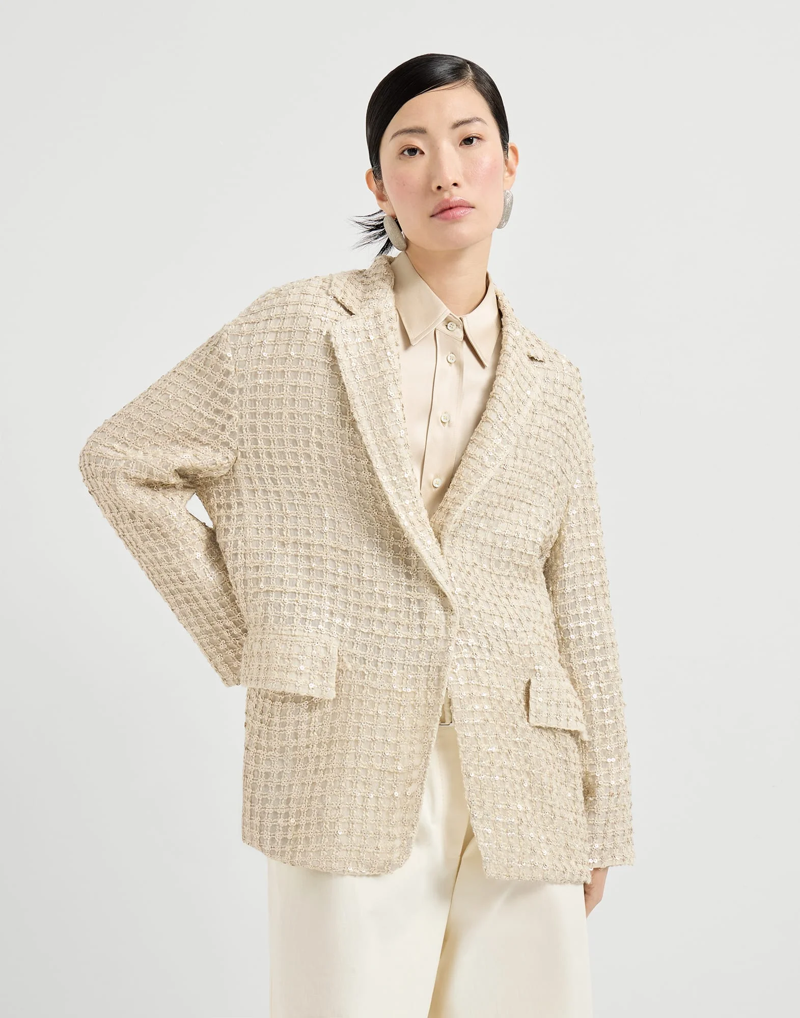 The season's precious dazzling net embroidery enriches the informal style of this silk organza blazer. Sophisticated net-like craftsmanship, highlighted by the shimmering reflections of sequins, gives the garment a vibrant three-dimensional effect and a very feminine appearance. The relaxed silhouette is completed with a thin suede belt that gathers the volume in the waist. MATERIALS The pure silk organza is characterized by an ultra-lightweight, semi-transparent texture with a crisp hand. DETAILS Horn button closure Notched lapel Hand pockets with flap Detachable tie belt Special workmanship 100% SILK