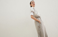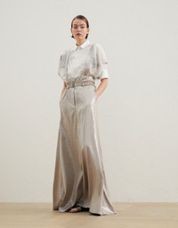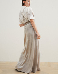 An extremely precious allure is paired with menswear-inspired details in this Paper-bag skirt. The elegant Dazzling satin is enriched with an embroidery of small, shiny paillettes that gives a sparkling effect to the entire surface of the garment. The soft, ethereal proportions create an effortless silhouette and are paired with the stylish details of the belt and suspenders, introducing a sophisticated nod to classic, tailored elegance. MATERIALS The result of a long and complex process involving machinery and artisans, the elegant silk-blend Dazzling satin fabric showcases a bright, glossy effect with a fluid hand. A sophisticated paillettes embroidery gives the entire surface of this piece a very sparkling look, while a percentage of synthetic fiber provides added comfort. DETAILS Zip closure with button Front pockets Back welt pockets Detachable belt Detachable suspenders Silk-blend crêpe lining 80% ACETATE, 20% SILK