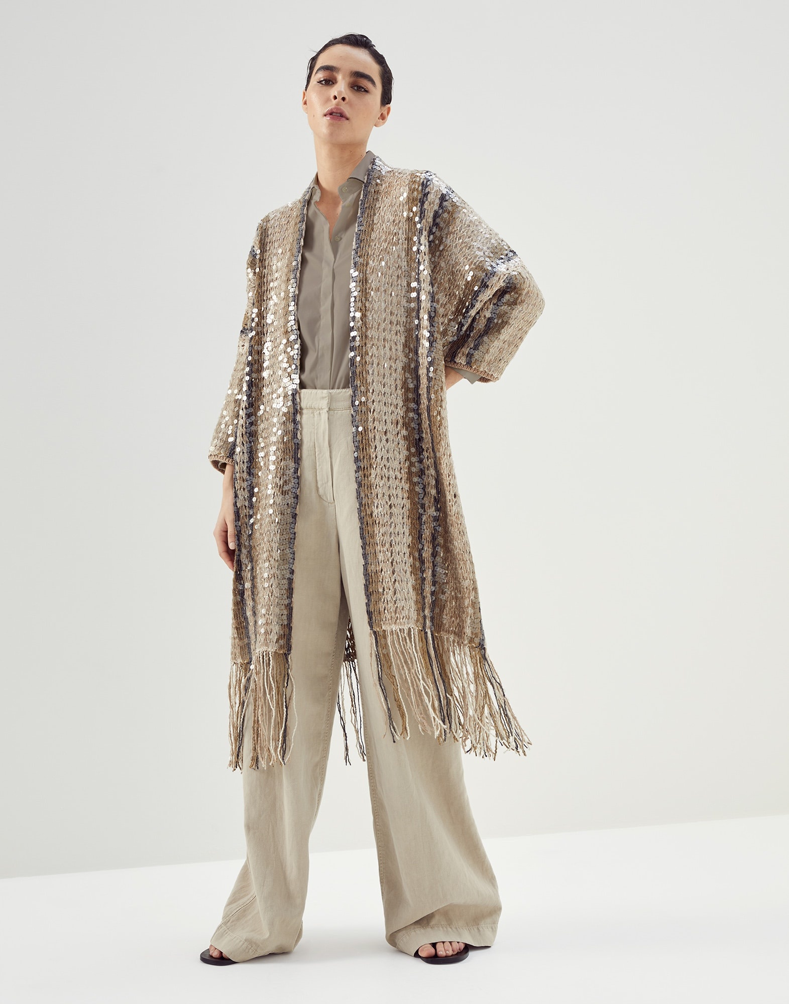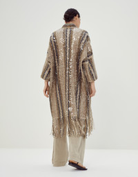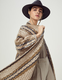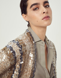 Special embroidery elevates the style of the garment, which becomes the main player of precious and feminine outfits. The result of a specially calibrated combination of innovation, technology and craftsmanship, the embroidery's unique design expresses seasonal inspiration with confidence. MATERIALS The result of complex research and experimentation, the particular workmanship involves a special machine embroidery that stems from the craftsmanship of artisans. The jute and cotton yarn, with a dry hand and a typically "rustic" appearance, is crafted in different shades to create a striped design in the season’s colors. Afterwards, transparent paillettes are applied to create an all-over embroidery with shiny, elegant tones. DETAILS Drop shoulder Hem with fringe Special workmanship 55% JUTE, 35% COTTON, 10% NYLON