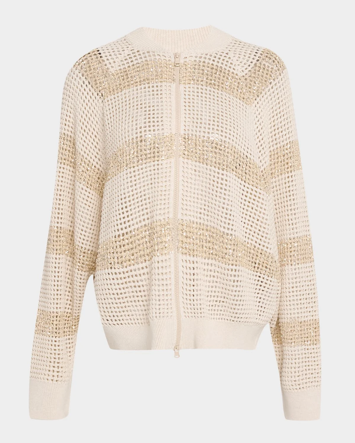 Brunello Cucinelli bomber cardigan is crafted of a cotton open knit featuring dazzling paillette striped intarsia inspired by glistening water reflections Baseball collar; zip & nbsp;front Long raglan sleeves Realxed fit Hip length Ribbed cuffs and hem Cotton Dry clean Made in Italy "SIZE & FITModel measurements: 5 & apos;10"" tallModel is wearing a US size 4/Small"