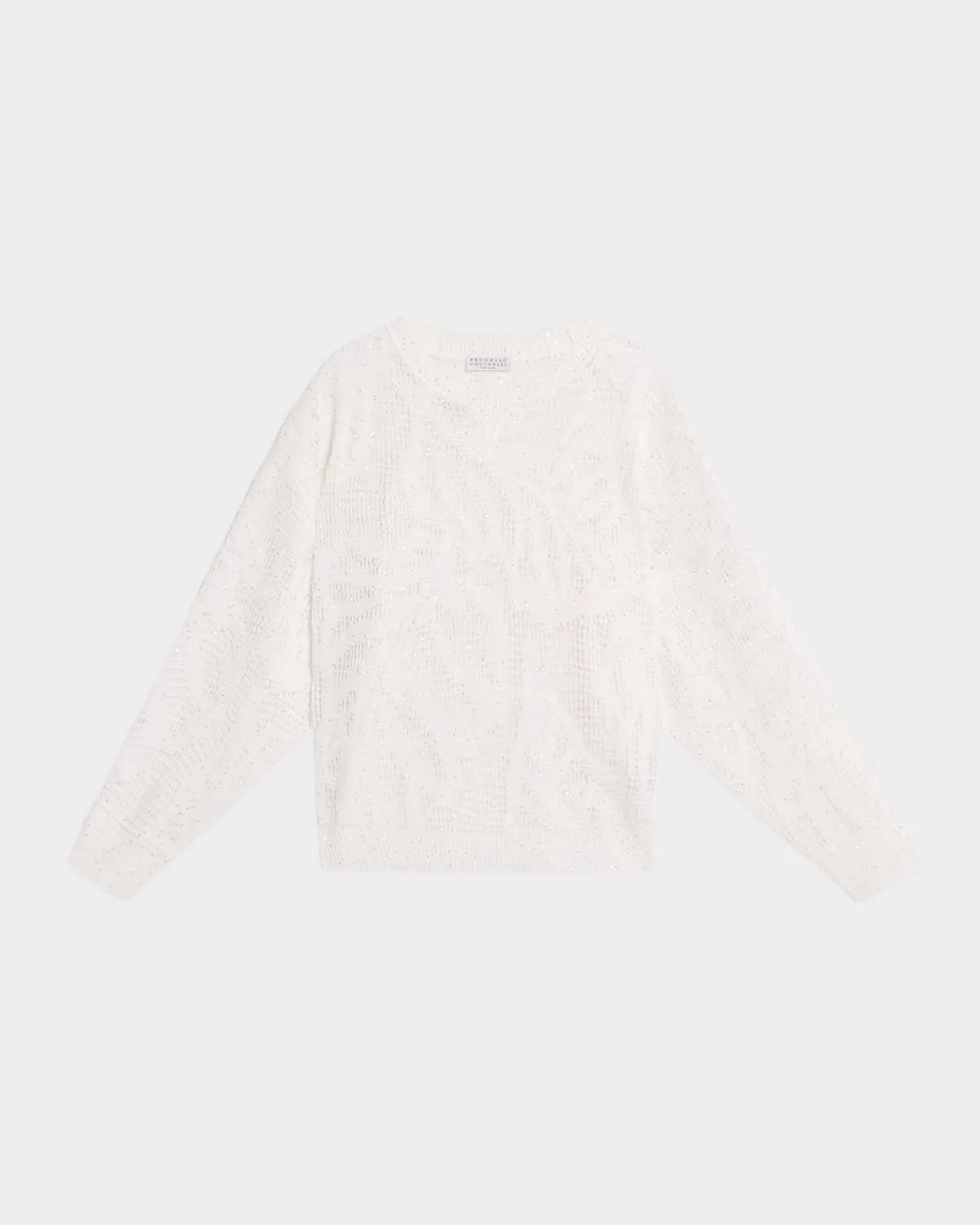 Crafted from water lily & nbsp;lace-like open net knit, this sweater from Brunello Cucinelli shimmers with micro paillettes Crew neckline Long sleeves Drop shoulders Loose fit Hip length Ribbed cuffs and hem Pullover style Linen/cotton Dry clean Made in Italy SIZE & FITModel measurements: 5 & apos;10" tallModel is wearing a US size 4/Small