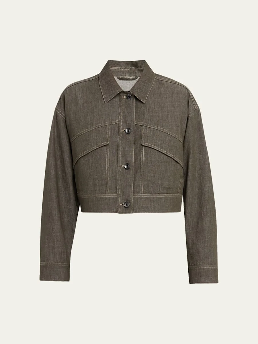 Brunello Cucinelli denim jacket is crafted from a nonfaded gray washed denim accented with contrast topstitching Point collar; singlebreasted front Long sleeves; button cuffs Chest flap pockets Relaxed fit Cropped length Buttonta hem Cotton Made in Italy
