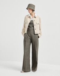 Relaxed style and refined details define the contemporary allure of these denim-effect twill wide smart trousers. The double pleats in the front add a tailored touch to the garment, characterized by soft lines that develop generously down the leg to define a nice and comfortable fit. The shiny monili embroidery adds a delicate touch of feminine sparkle in true Brunello Cucinelli style. MATERIALS Characterized by a look reminiscent of classic denim, the pure cotton twill is a lightweight, comfortable fabric, suitable for wearing during the warmer months. DETAILS Zip closure with metal hook and backing button Slanted front pockets Double pleat Back patch pockets Plain hem Nickel-free monili decoration 100% COTTON