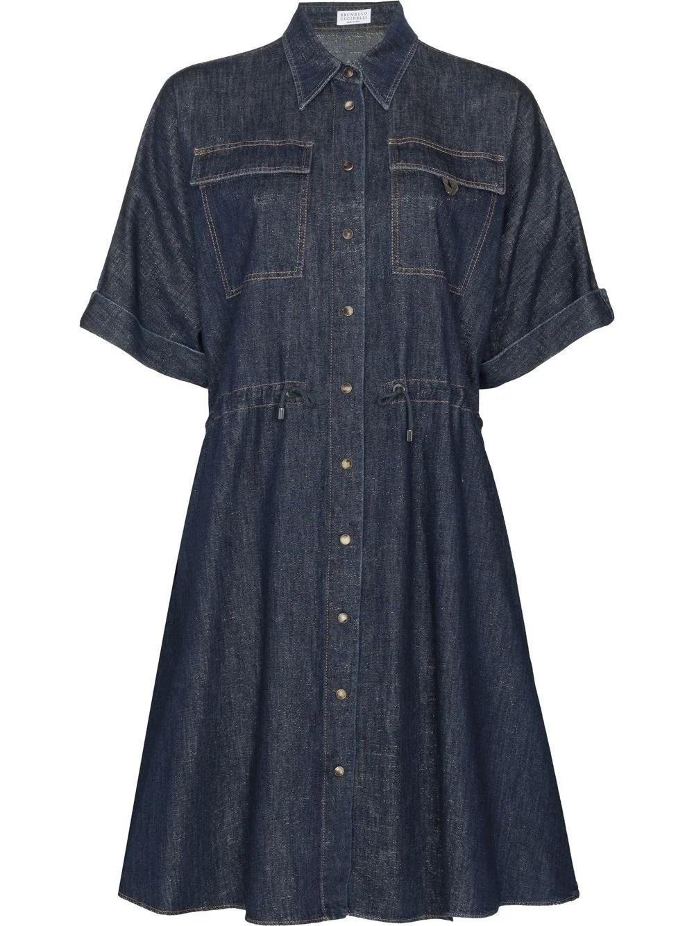 denim midi shirt dress navy blue cotton blend ruched detailing classic collar front button fastening short sleeves flared hem Made in Italy Composition Brass 100%, Cotton 66%, Viscose 28%, Polyester 4%, Polyamide 2% SIZE & FIT Model measurements Height 5 ft 11 in(1.8 m) Bust/Chest 31.49 in(80 cm) Hips 36.41 in(92.5 cm) Waist 25.59 in(65 cm) Measurement HIPS 47.24 in(120 cm) LENGTH 40.15 in(102 cm) WAIST 36.22 in(92 cm) FittingInformation This piece fits true to size. We recommend you get your regular size Cut for a loose fit. Comes with an adjustable belt for a flexible fit at the waist Made with a mid-weight fabric Washing instructions Dry Clean Only