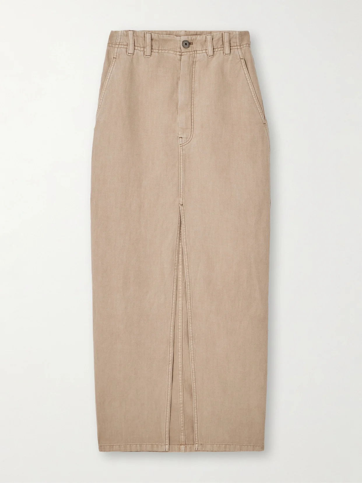 Brunello Cucinelli sources fabrics from carefully selected suppliers prized for their quality and innovation. This midi skirt is made from beige denim and designed with a dramatic front split. Wear yours with sneakers or knee boots.