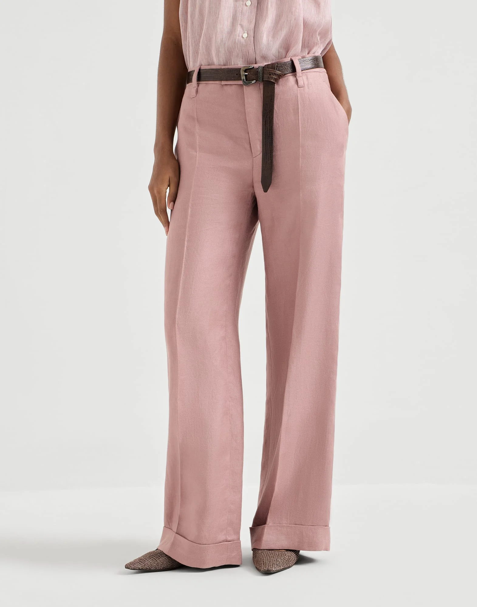 Summery materials and informal proportions define the style of these loose flared trousers. Regular on the hips, the fit develops wide and comfortable along the leg and gives a contemporary allure to the design, while the lightweight fabric brings out the season’s colors. The shiny monili embroidery adds a feminine sparkling note in true Brunello Cucinelli style. MATERIALS Linen diagonal combines the freshness and elegance of the natural fiber with a twill-weave, enriching the fabric with a refined diagonal texture. This combination gives the material strength, breathability and an attractive irregular hand. DETAILS Zip closure with metal hook and backing button Slanted front pockets Back welt pockets Cuffed hem Nickel-free monili decoration 100% LINEN