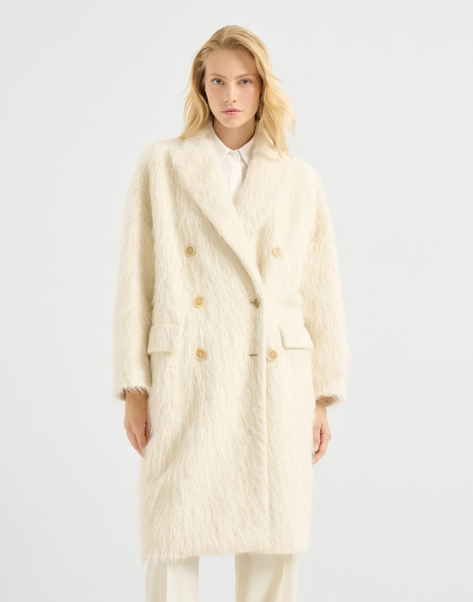 Precious details and refined materials come together in this wispy alpaca coat. The garment features an oversized cut, creating a pleasant sensation of warmth and coziness, emphasized by the pronounced lapels and the double-breasted closure. A shiny monili detail, the iconic embellishment of the Brunello Cucinelli collections, adds a delicate feminine sparkle. MATERIALS The wispy alpaca is characterized by its lightweight, airy texture with a soft, full appearance that enhances the qualities of the natural fibers. DETAILS Resin buttons closure Silk-blend crepe lining Lapel collar Patch hand pockets with flap Nickel-free monili decoration 75% ALPACA, 25% POLYESTER