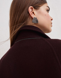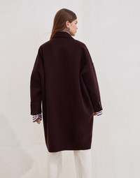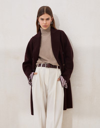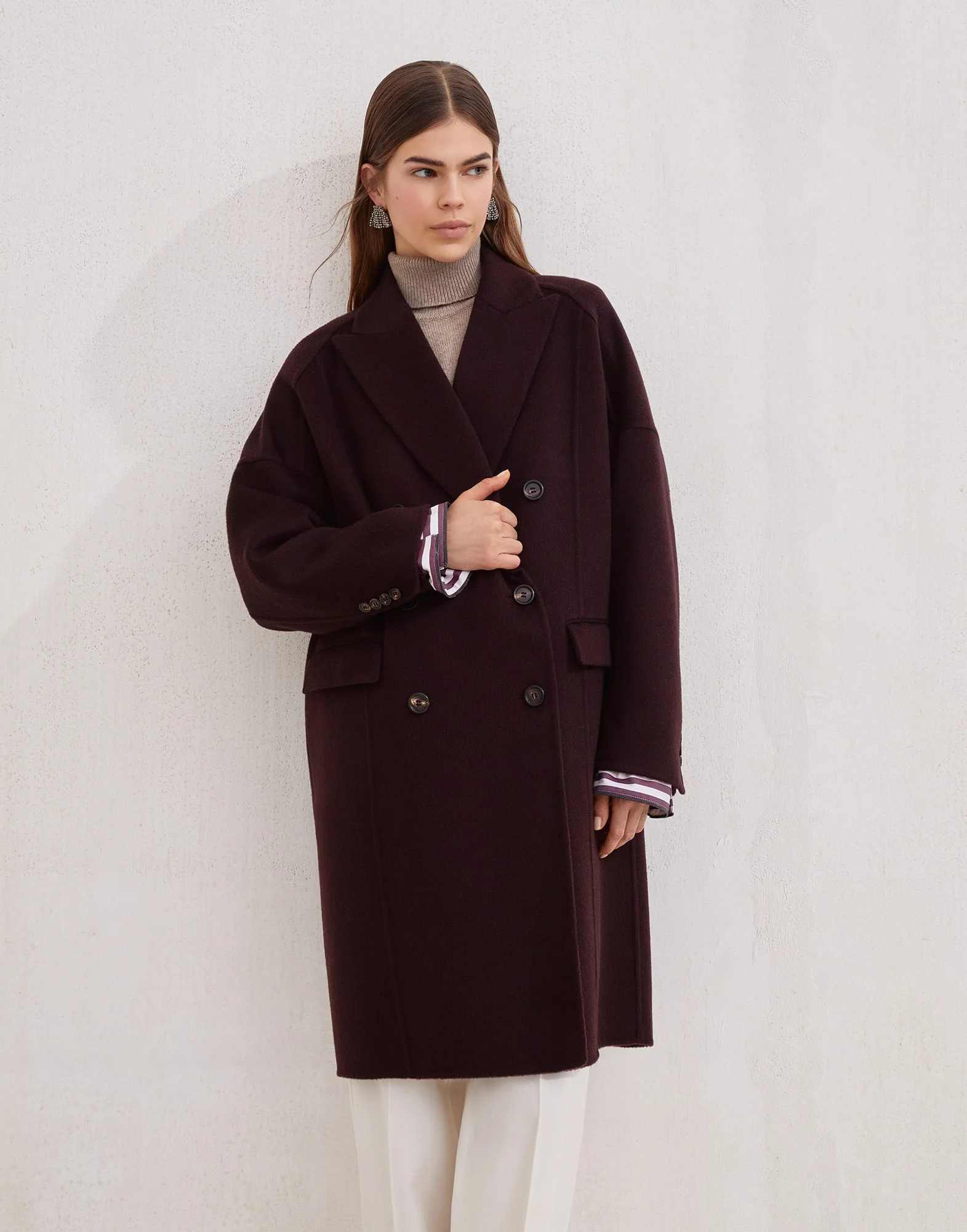 Refined fabrics enhance the elegant, cozy style of this double coat. The plush cashmere beaver is crafted with two layers of fabric bonded together to create a garment with a compact texture that is extraordinarily soft to wear. The oversized fit is emphasized by the pronounced lapels, double-breasted closure and relaxed sleeves. The precious monili insert adds a delicate sparkling detail. MATERIALS The excellence of cashmere is combined with a special process: two thin layers of cashmere fabric are manufactured together and, at the same time, connected by two cashmere threads using a complex manual process paired with machine work. The result is a warm, compact and cozy fabric that showcases the same appearance on both sides. DETAILS Horn button closure Hand pockets Cuffs have four horn buttons Nickel-free monili decoration 100% CASHMERE