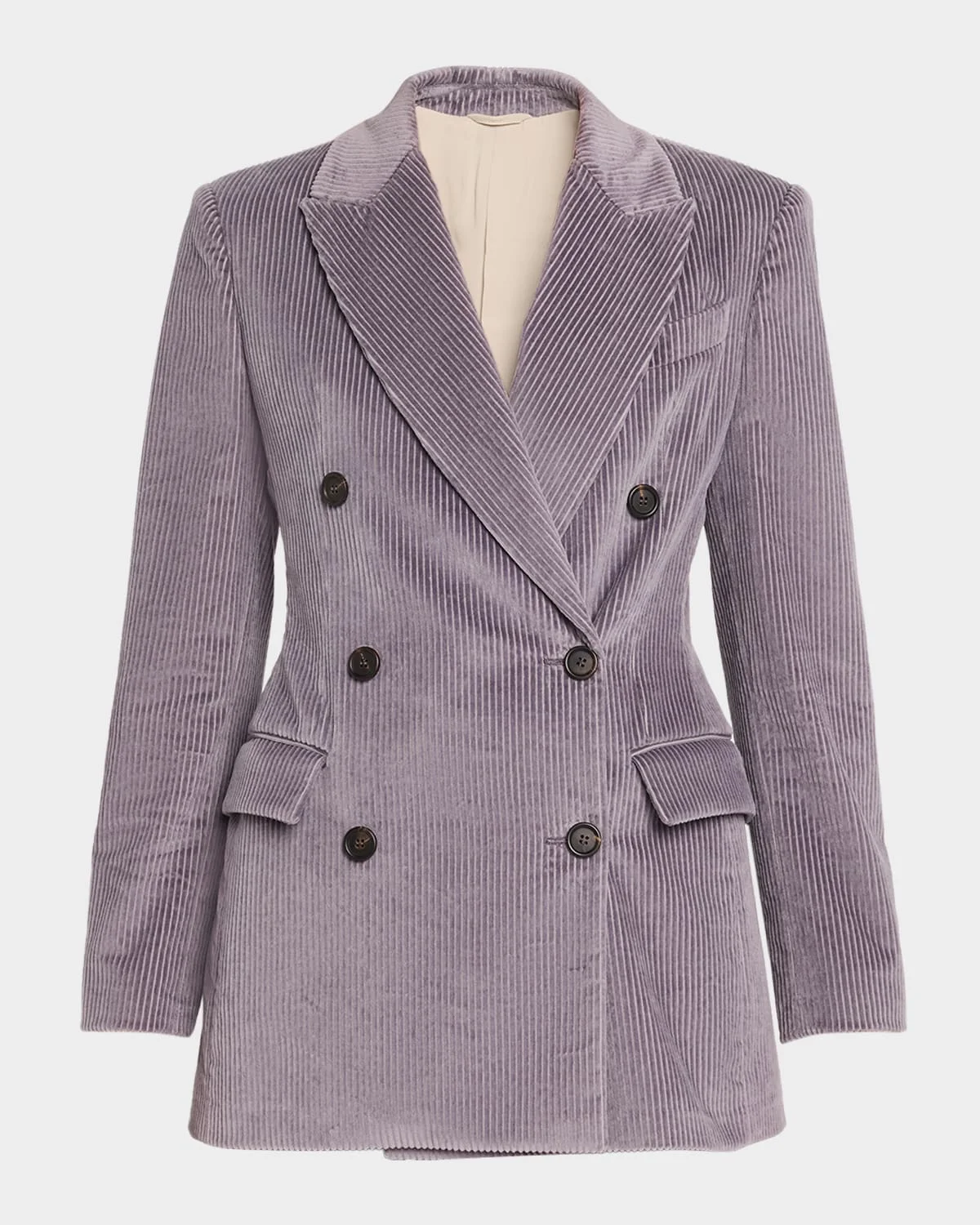 - Crafted from plush cotton corduroy, this blazer by Brunello Cucinelli is finished with buffalo buttons - Peak lapels; double-breasted front - Long sleeves; button cuffs - Single chest welt pocket - Hip flap pockets - Tailored fit - Mid-length - Cotton - Lining: Acetate/silk/polyester - Dry clean - Made in Italy