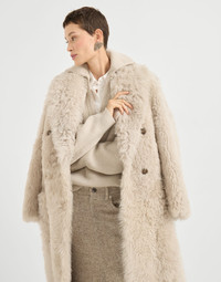 This soft shearling coat is characterized by a cozy, plush, and distinctly wintry look. The refined material’s ultra-soft, smooth texture highlights the garment’s iconic lines and gives the silhouette a slightly voluminous effect. The pronounced lapels and double-breasted closure emphasize the oversized silhouette. MATERIALS The refined soft shearling is characterized by its extremely plush fleece. A finish creates a smooth effect that is slightly shimmering at the same time. DETAILS Metal button closure Lined Lapel collar Patch hand pockets SHEARLING